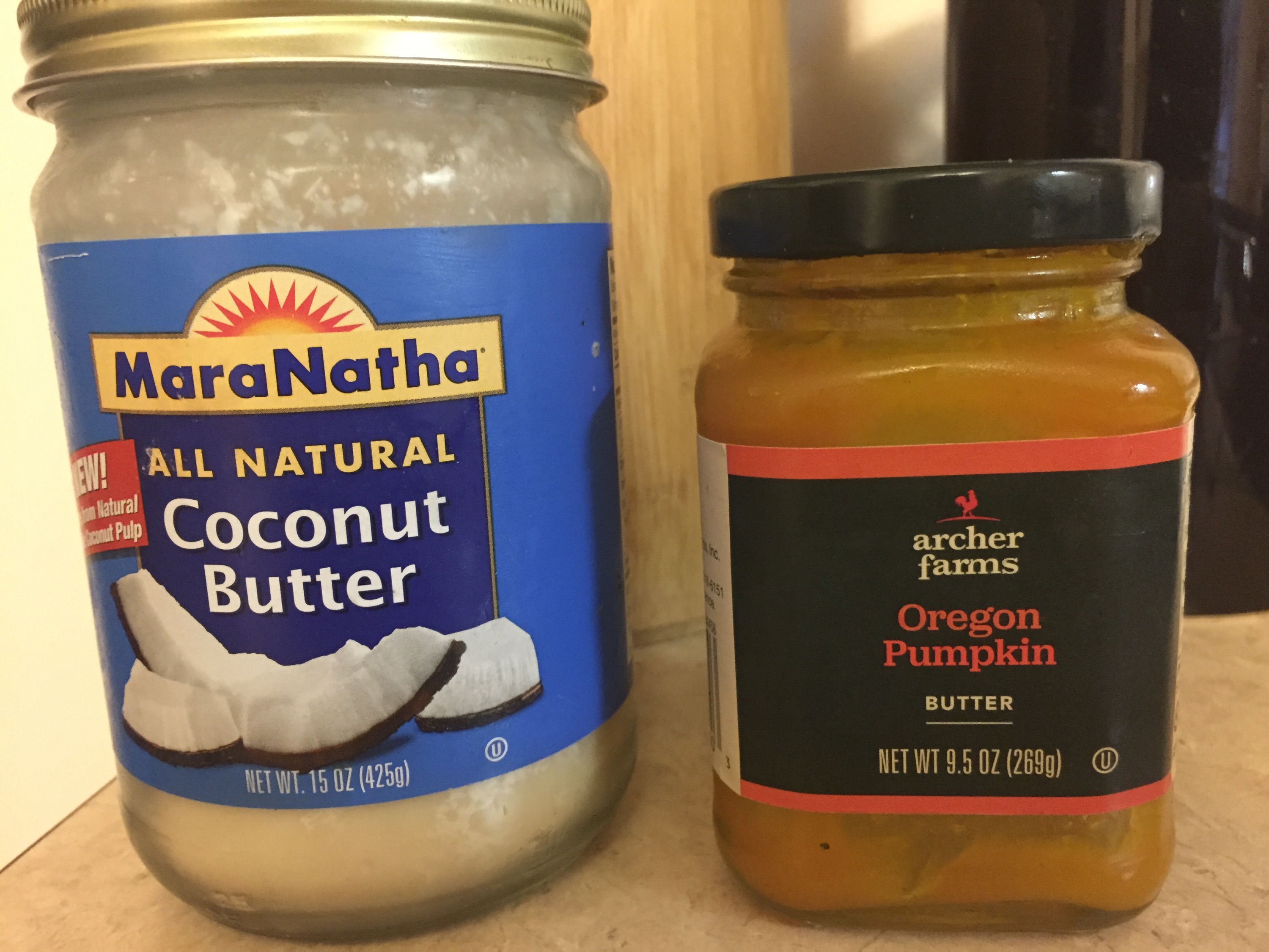 So I sifted through the pantry, counters and the freezer and decided on butternut squash. I love butternut squash and since they had fries I was having squash. I eventually snapped out of my ruined mood and carried on with my meal when I found a jar of pumpkin butter and coconut butter.